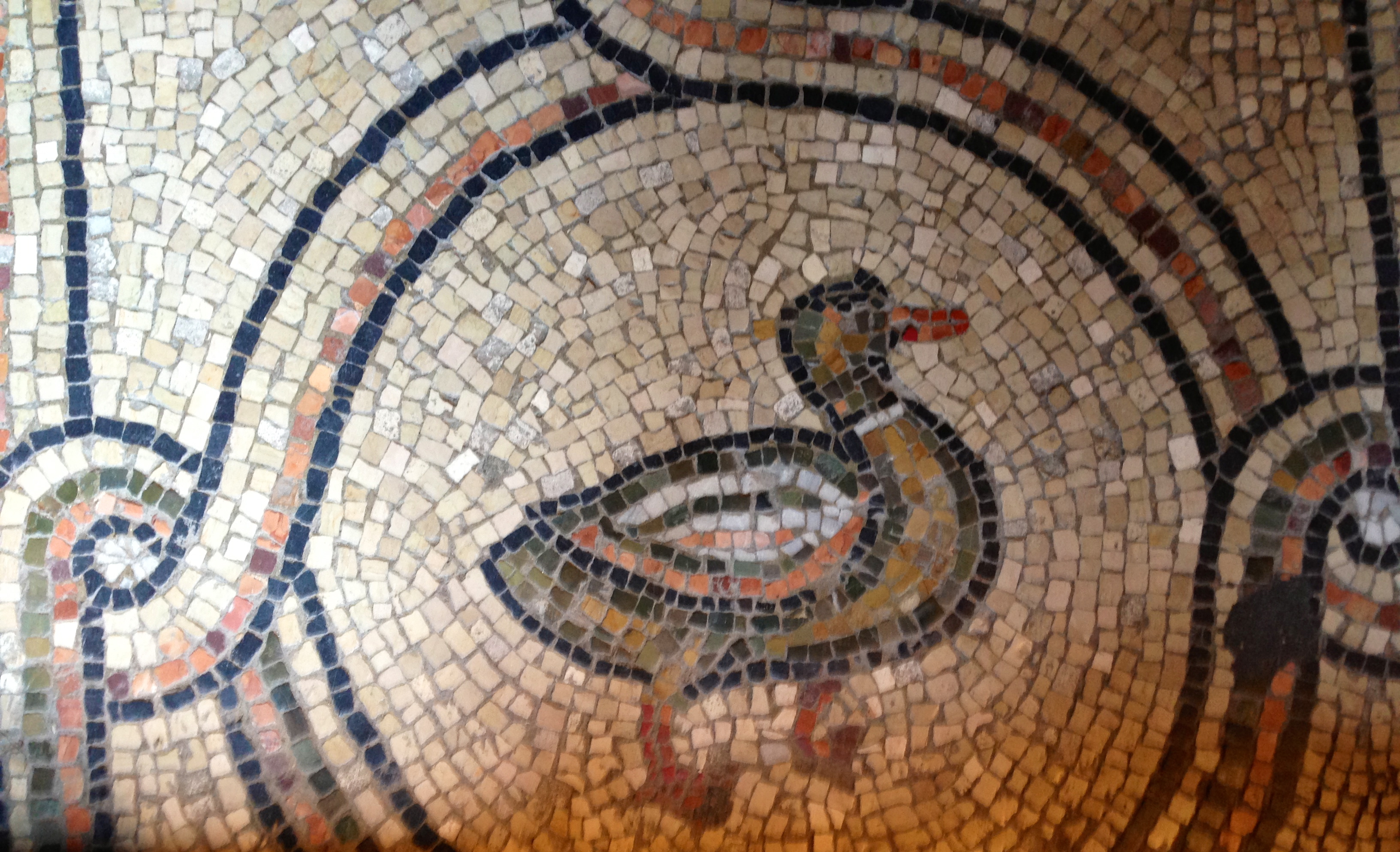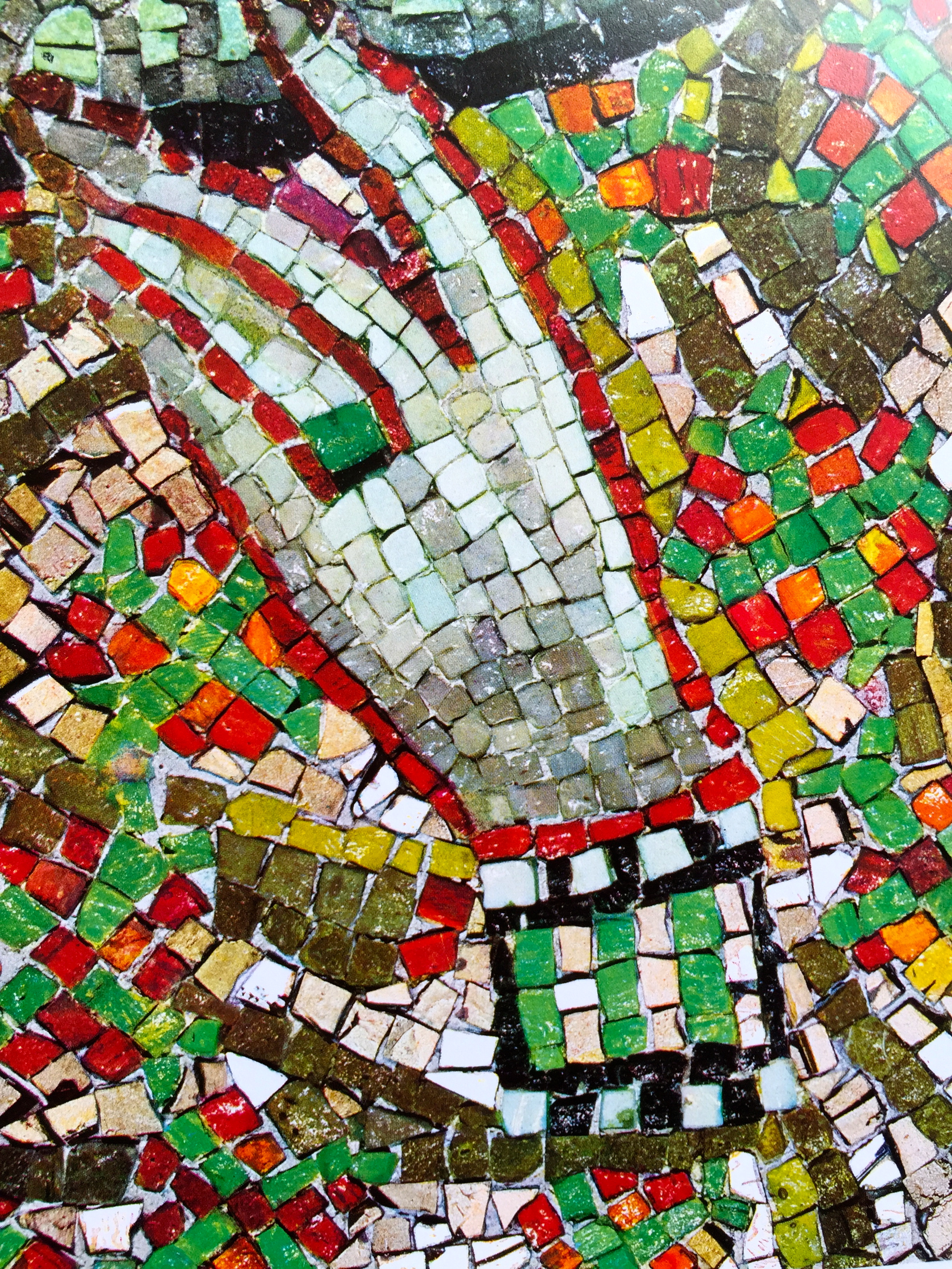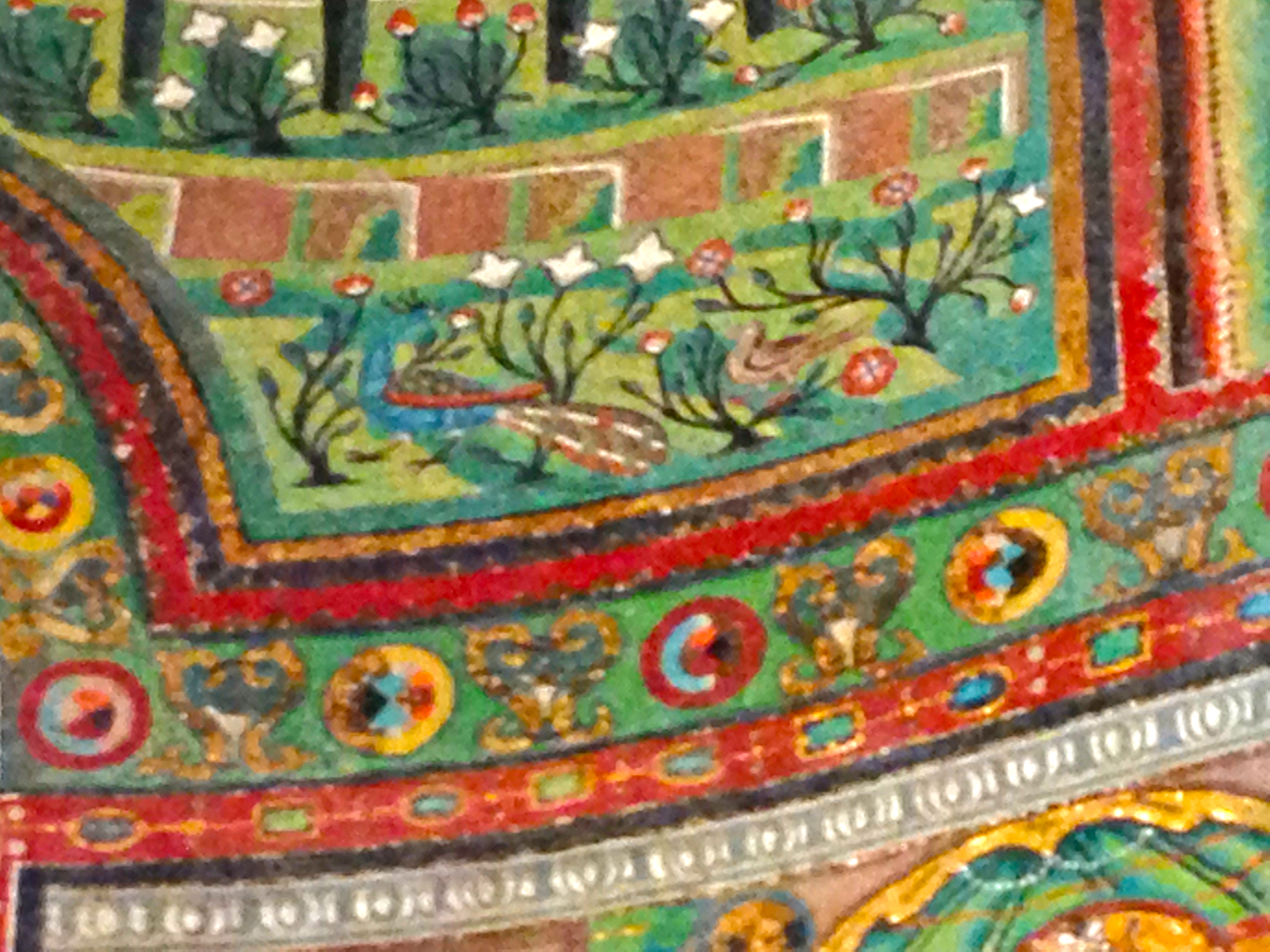 The “painting” is done with tiny glass tiles called tesserae. The singular is tessera. Many of the tesserae used in Ravenna were clear glass on two sides, sheathing a gold leaf center. This allowed for the light to reflect off both the glass and the gold, creating a glittering, luminous effect. While most of the terrerae were made of glass, often the faces, rough garments, or natural features like rocks were made from tiles of marble or limestone.IMG_1505