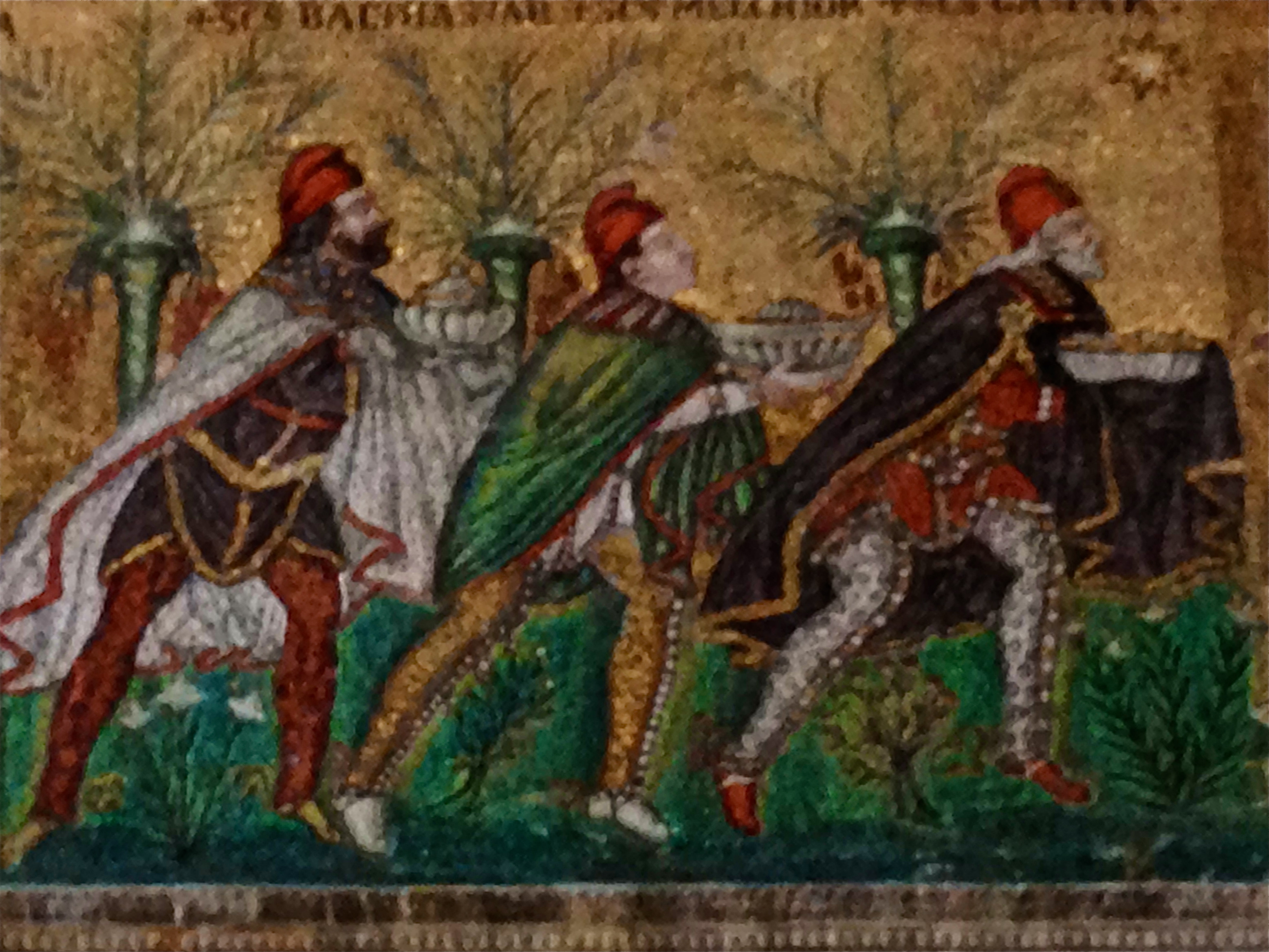 In the rectangular, airy nave, you are surrounded by miracles and processions. Along the top on one side are 13 small mosaics of Jesus’ miracles. Under them is a procession of 22 mosaic virgins led by the 3 Magi, identified here for the first time as Balthasar, Melchoir and Caspar. Keep an eye out for these wise men because they sport fantastically outrageous outfits that would make really great pajamas.