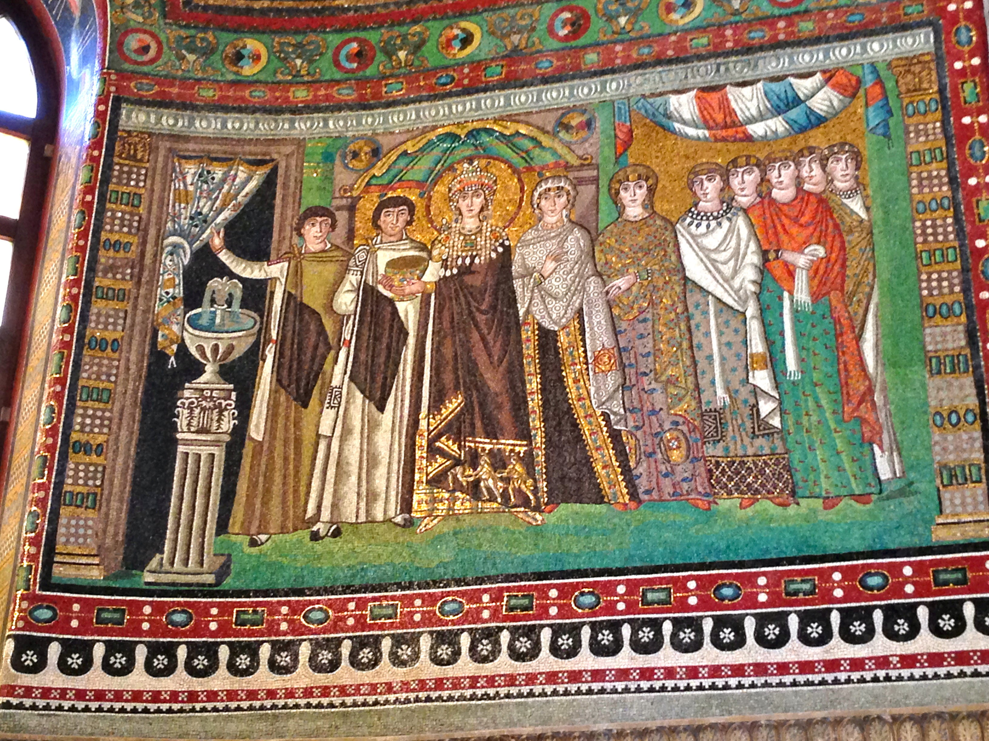 In 540, the Eastern Orthodox Christian Byzantine Emperor Justinian I (with his extraordinary wife, the ex-circus performer Theodora), based in Constantinople, then called Byzantium now called Istanbul, conquered Ravenna and established the Byzantine seat of government in Italy there.   From 540 to 600, the Byzantine bishops in Ravenna went wild building amazing churches, including the spectacular Basilica of San Vitale.