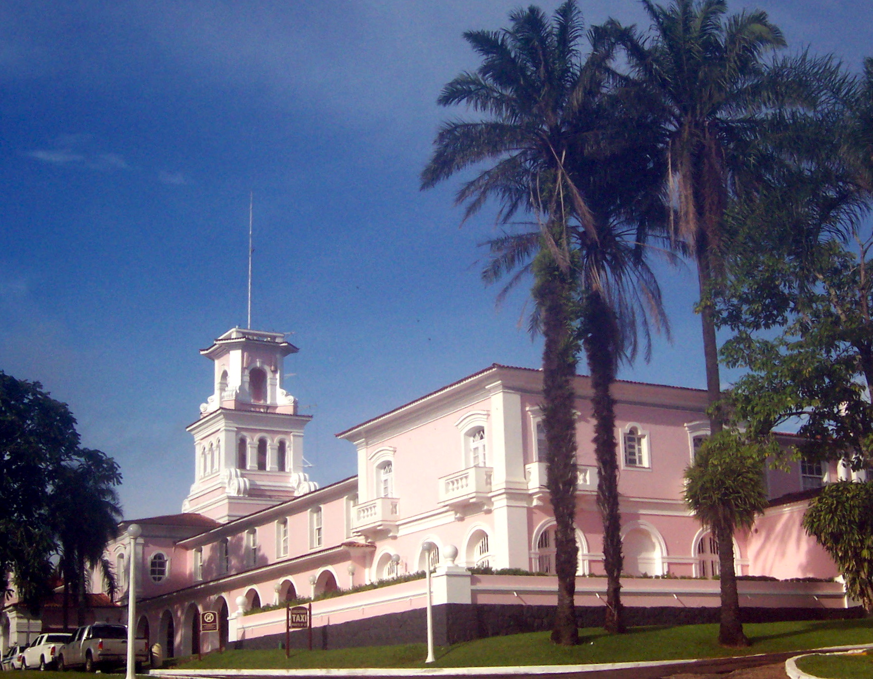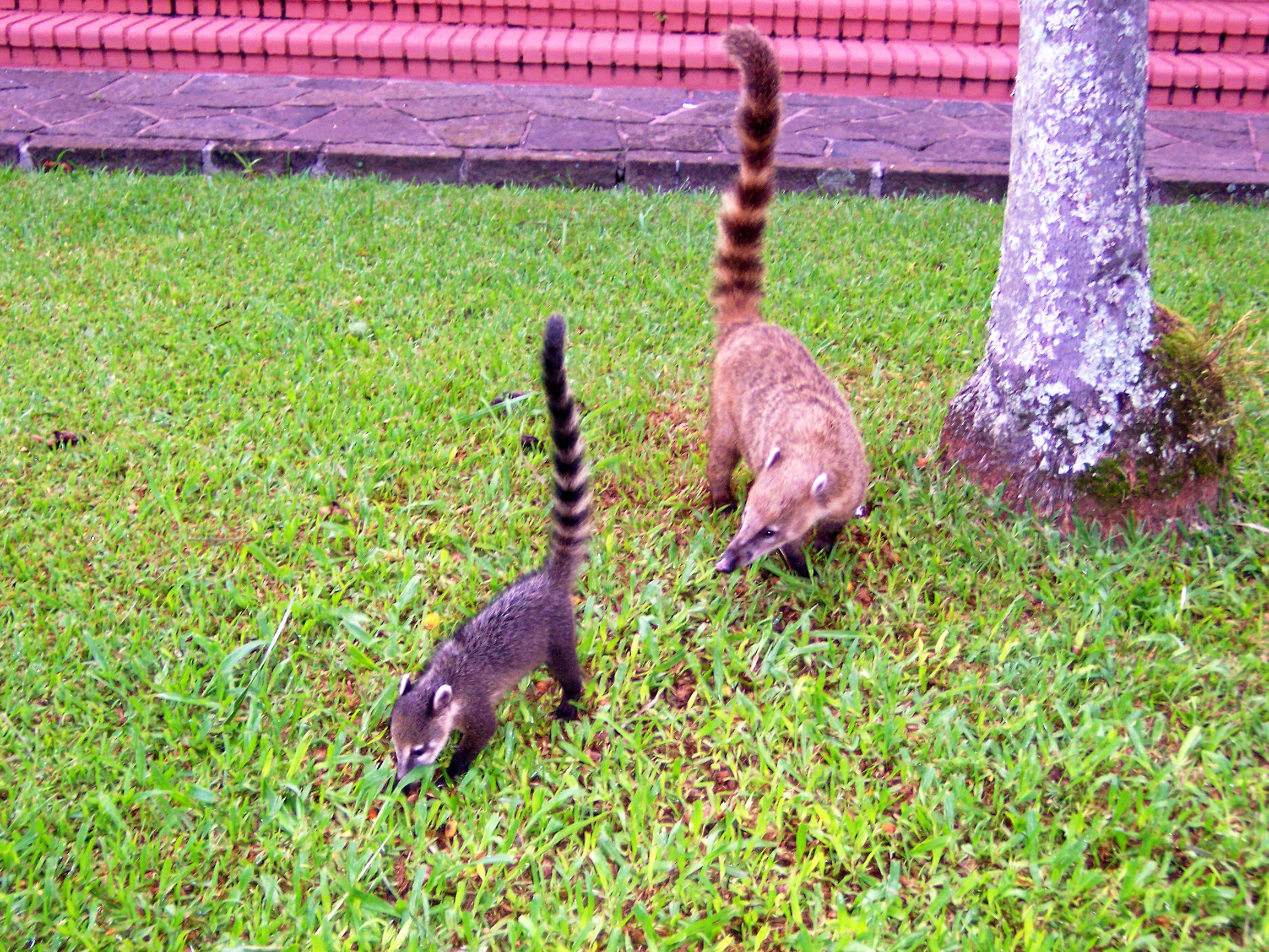 At one time, the lovely pink Cataratas had a beautiful view of the falls. Trees doing what they will, the view is now obscured from the building, but you can see it if you just walk across the driveway.  Even without the direct view, the hotel is beautiful with Portuguese Colonial architecture, carved wooden door frames, a gorgeous pool, a Paraguayan band, and lots of local coati.