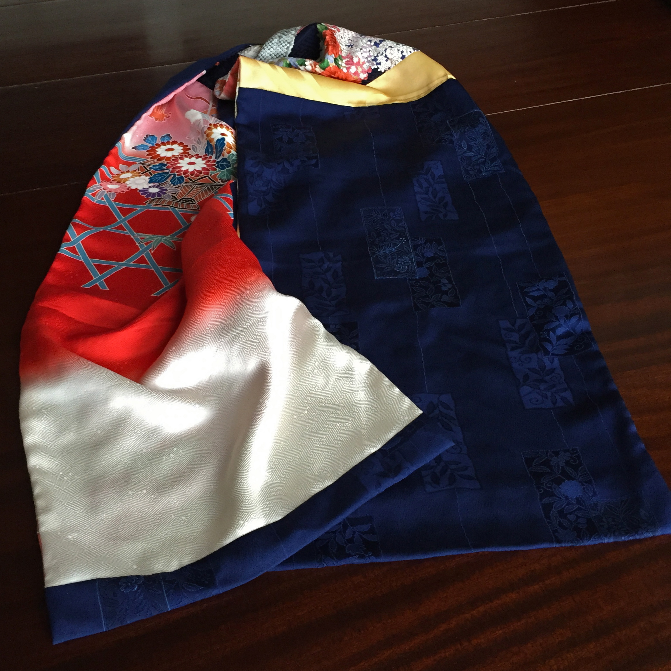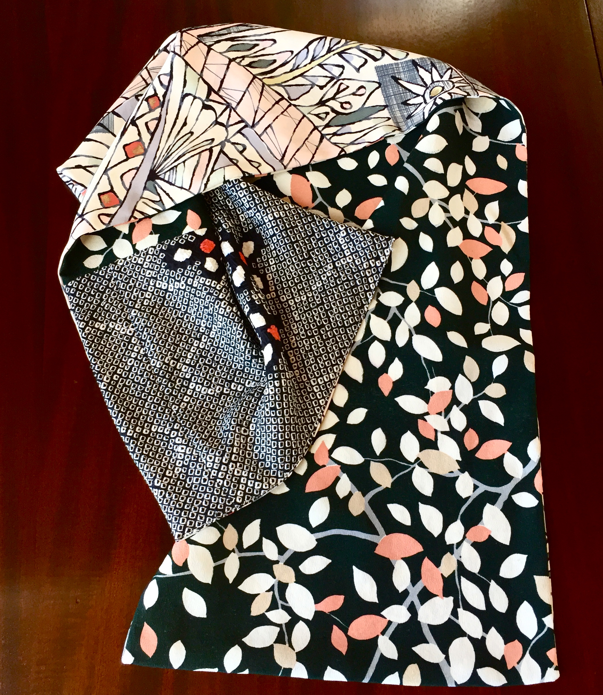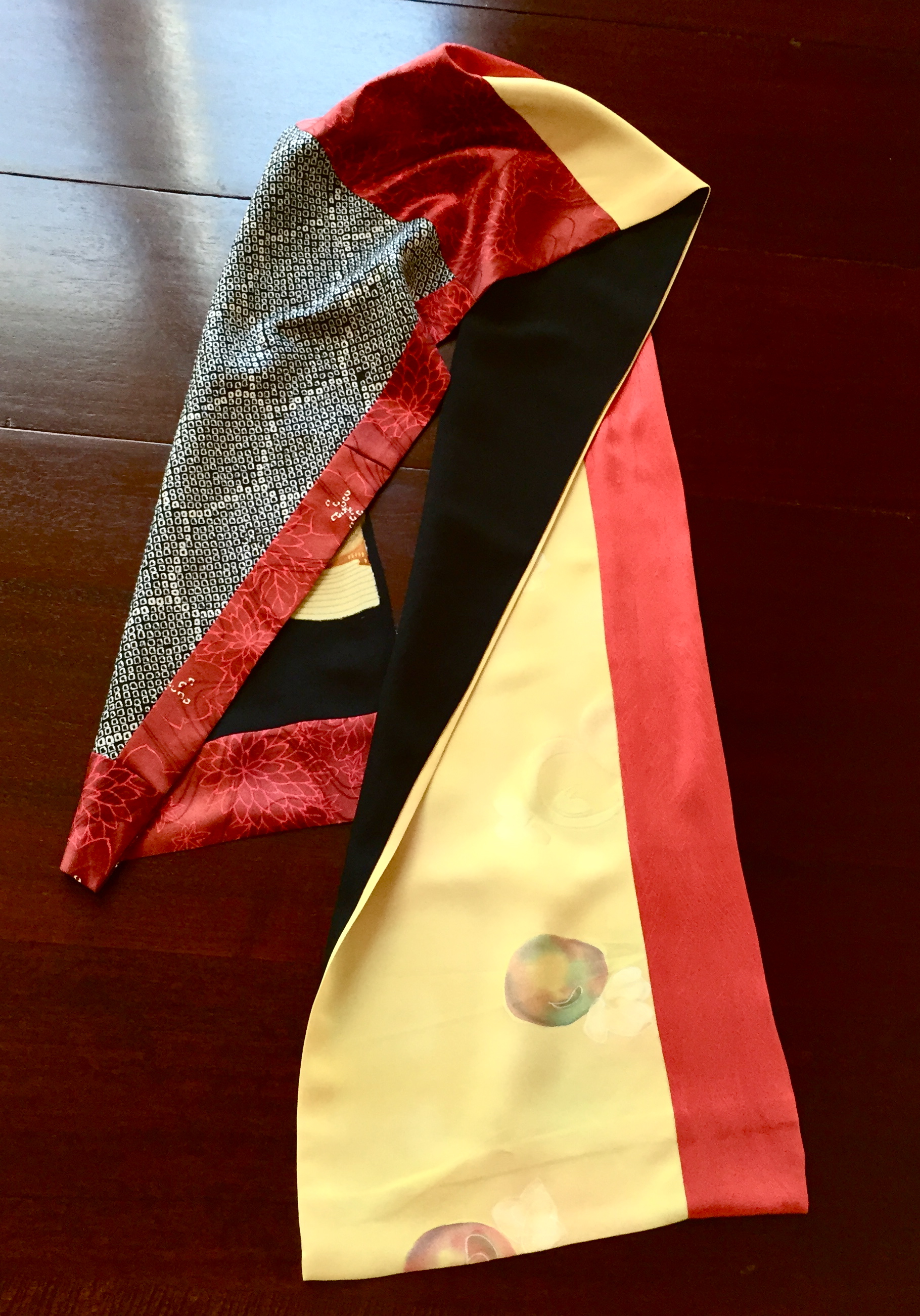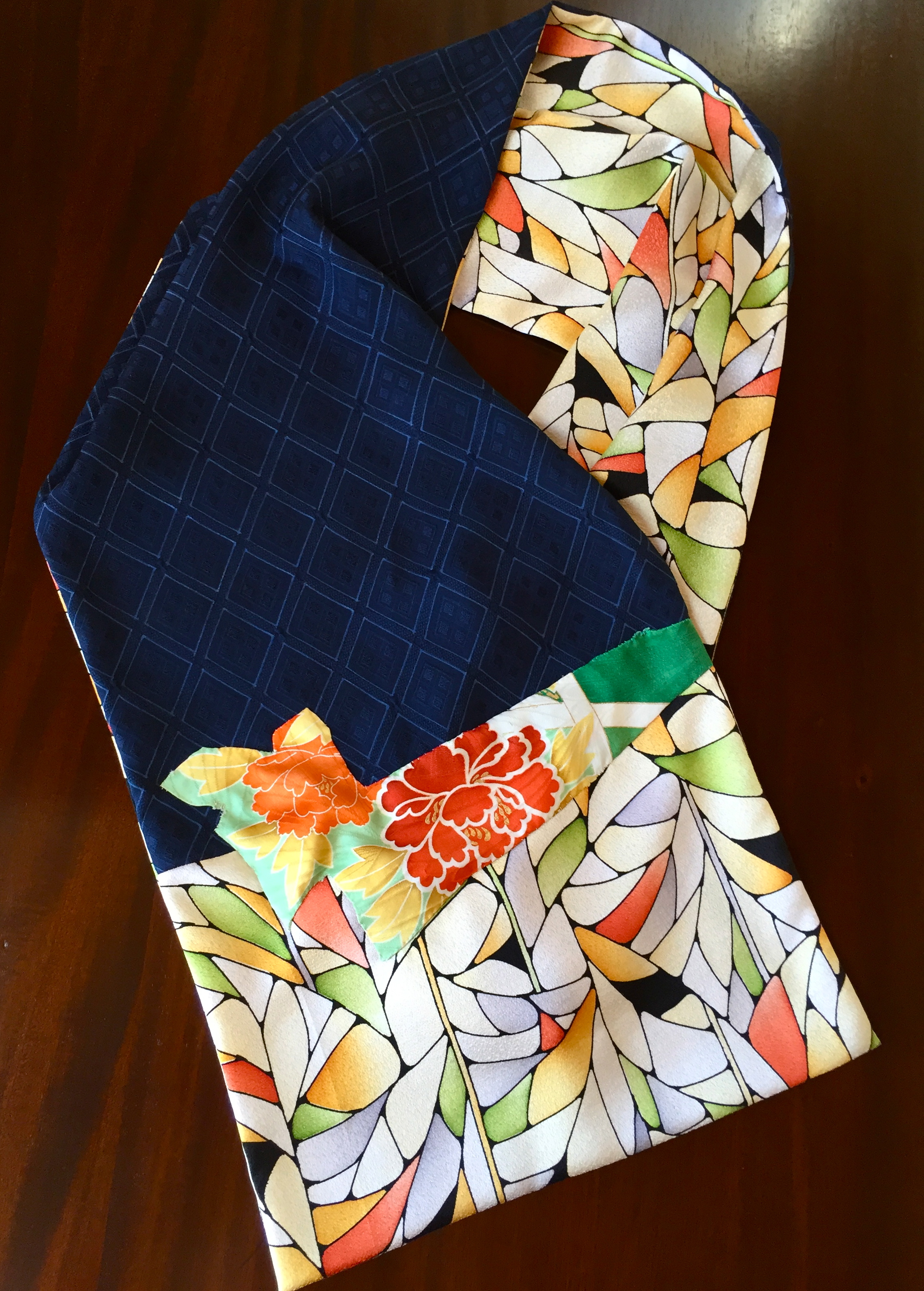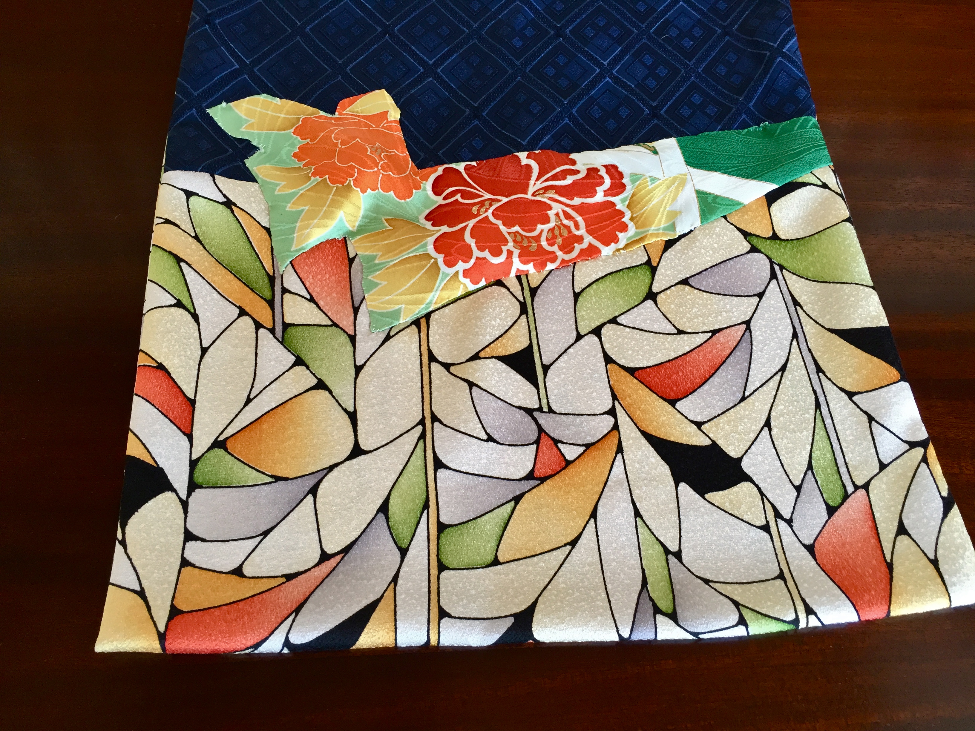 Finish the ends, line with beautiful cream-colored silk with shibori cranes, hand-sew the final seam, and it’s finished!