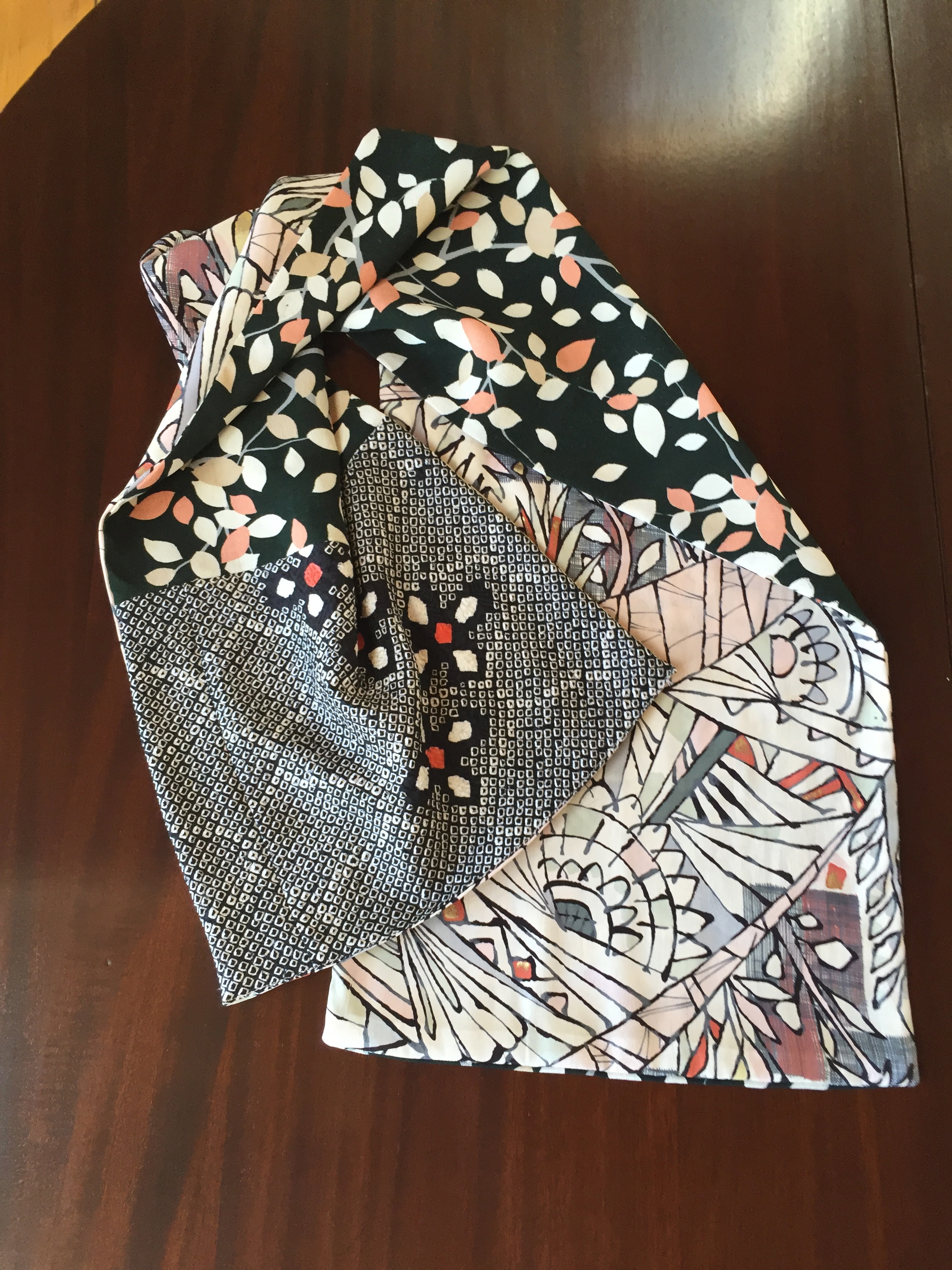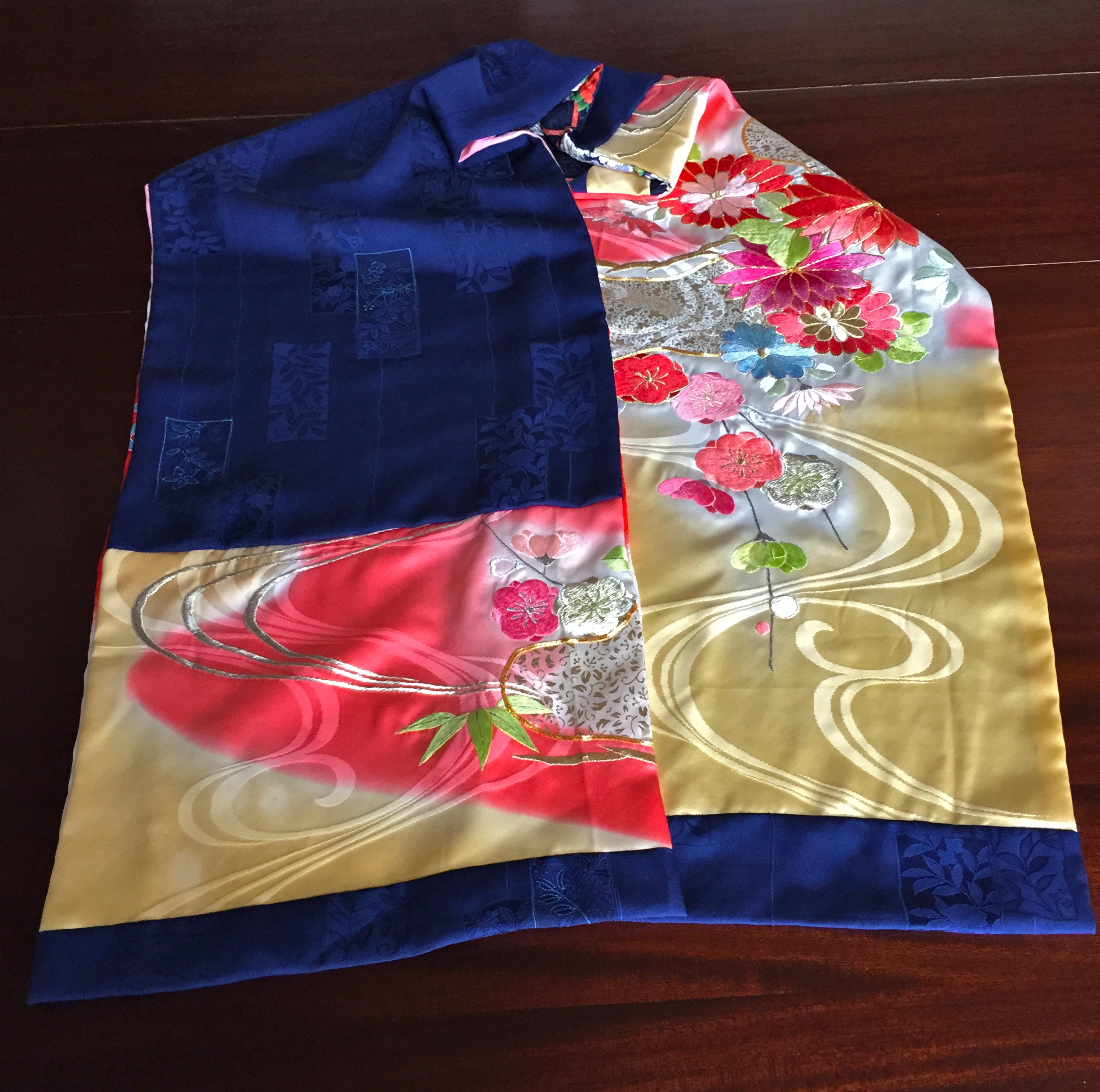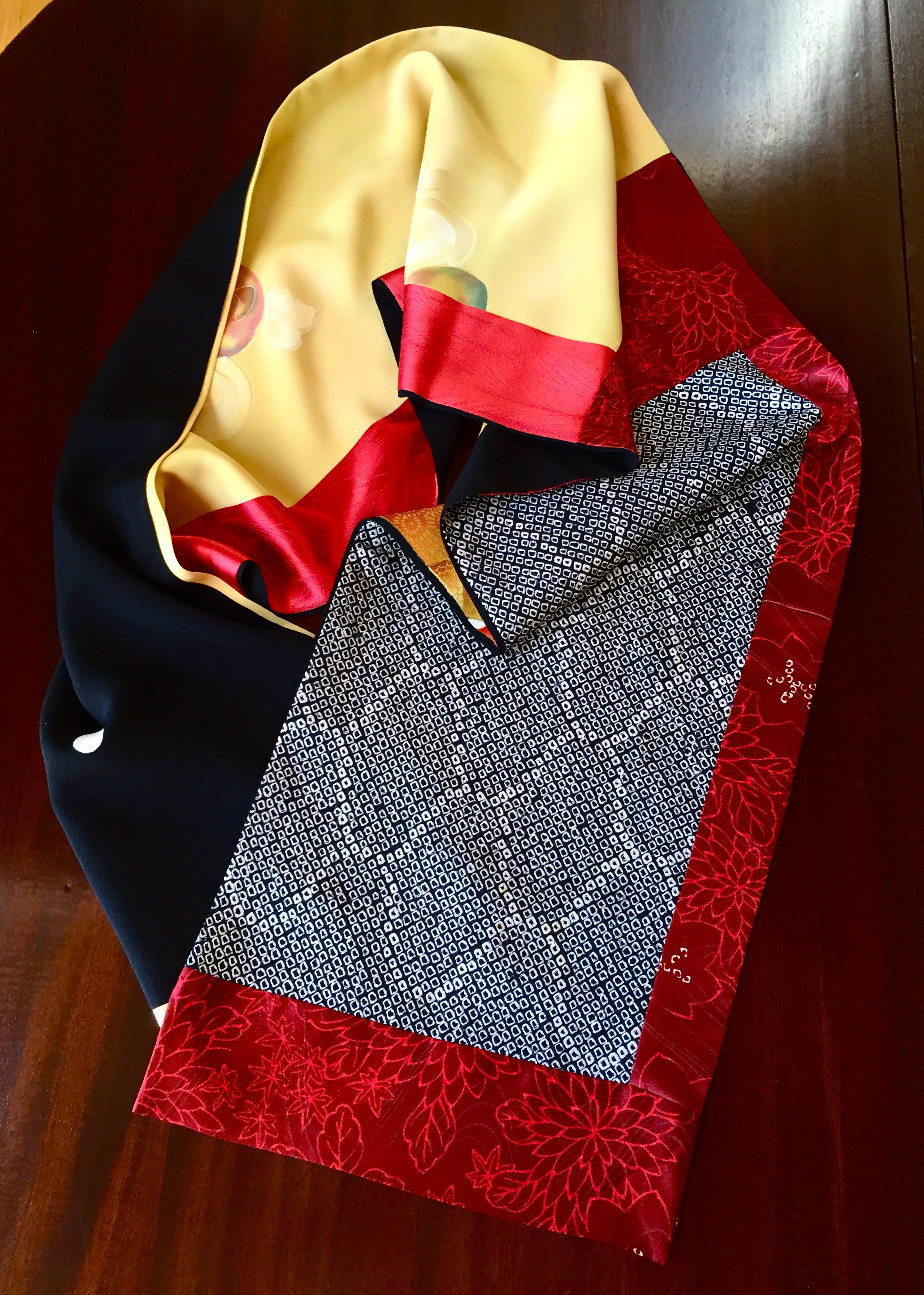 Well, after the To Celebrate Life scarf went to the highest bidder when the auction closed, a disappointed bidder still needed a scarf.  So, I made this one.  First, a trip to the kimono rack to pick out something really beautiful.