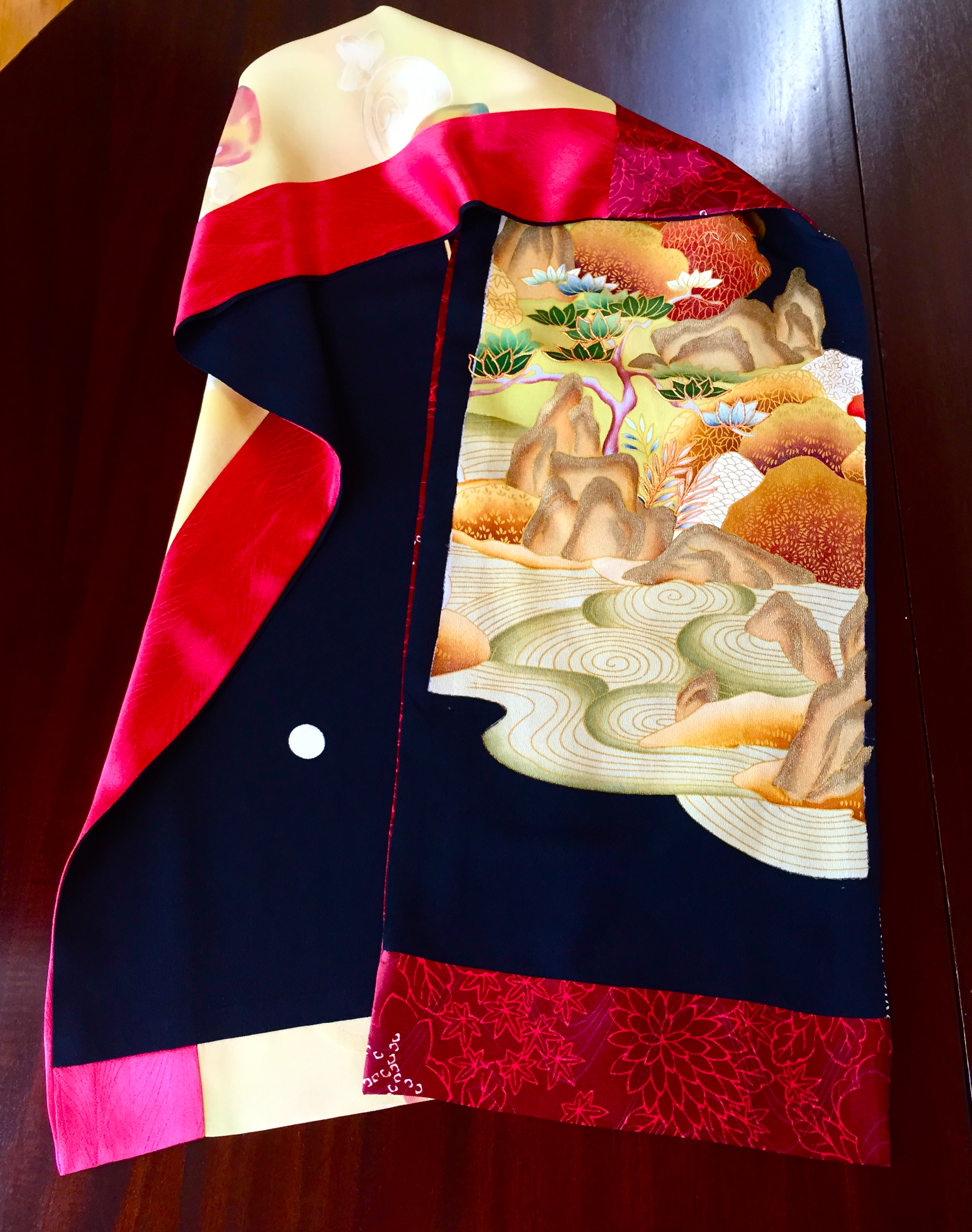 This will do nicely!  A kurotomesode–a heavily embroidered kimono traditionally worn by married women-from the Ichiroya Flea Market.  The small circle at the top is a family crest–one of five on the kimono.